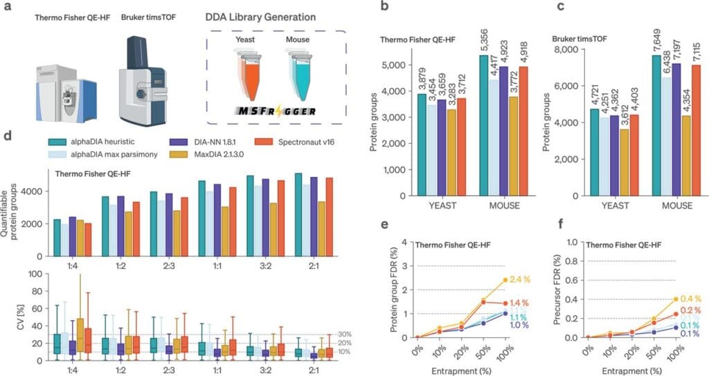Benchmarking alphaDIA against established software for library bases DIA search. Source: Wallmann et al., 2024. “AlphaDIA enables End-to-End Transfer Learning for Feature-Free Proteomics”, bioRxiv 2024.05.28.596182.