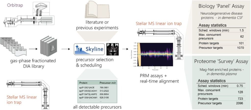 Plubell et al., from the MacCoss lab, demonstrate the development of highly multiplex targeted assays for cerebrospinal fluid (CSF) and plasma extracellular vesicles (EVs) using a cost-effective linear ion trap mass spectrometer, the Thermo Fisher Scientific Stellar.