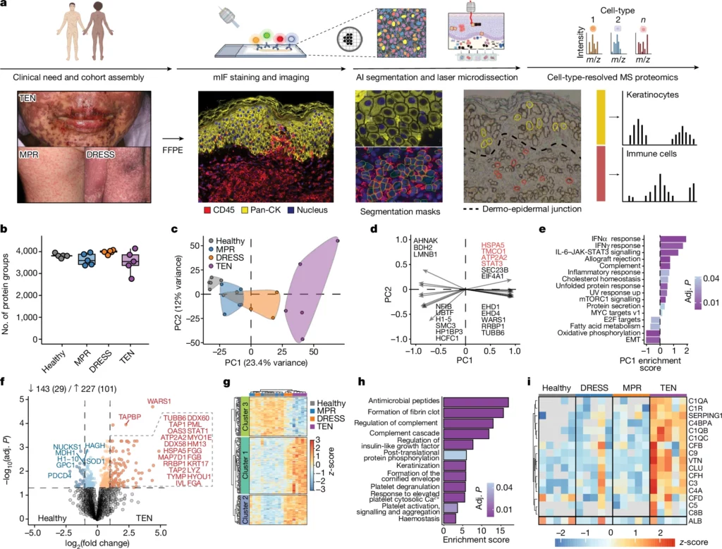 Toxic epidermal necrolysis (TEN) is a severe, life-threatening cutaneous adverse drug reaction characterised by extensive epidermal detachment and a 33% fatality rate. Despite various proposed mechanisms, the main drivers of keratinocyte cytotoxicity and epidermal detachment remain poorly understood, with no established treatment beyond supportive care. In a groundbreaking study, Nordmann et al. from the Mann lab at the Max Planck Institute of Biochemistry aimed to address this knowledge gap by investigating molecular mechanisms of cutaneous drug reactions and identifying potential therapeutic interventions for TEN.