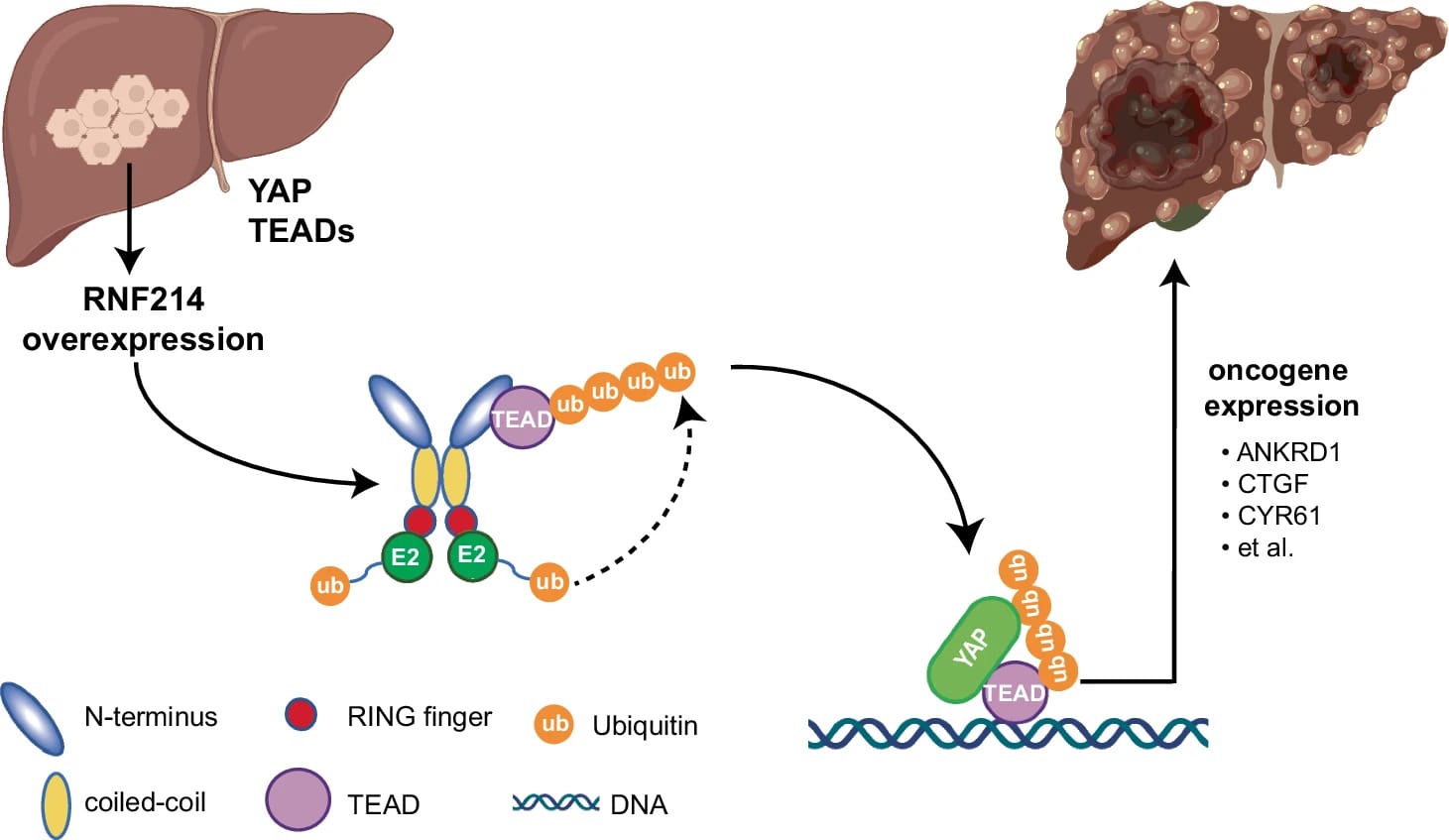 Working model of RNF214 functions in HCC. Source: Lin et al., 2024. “The RNF214-TEAD-YAP signaling axis promotes hepatocellular carcinoma progression via TEAD ubiquitylation”, Nat Commun 15, 4995 (2024).
