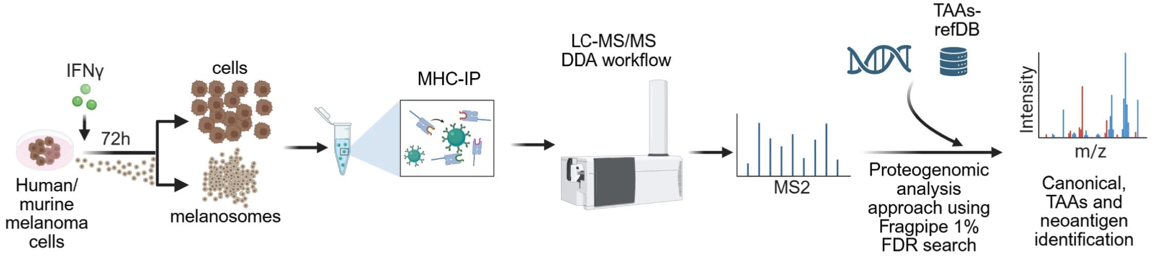 Experimental scheme of the proteogenomic immunopeptidome analysis workflow. From Chemla et al., 2025. “HLA export by melanoma cells decoys cytotoxic T cells to promote immune evasion.“ Cell (2025). doi: 10.1016/j.cell.2025.11.020; Licensed under the terms of the Creative Commons CC-BY 4.0 license.