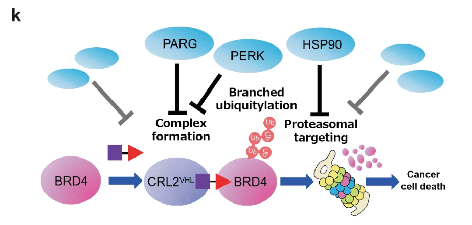 The researchers conducted a chemical screen and identified inhibitors of PARG, PERK, and HSP90 as enhancers of PROTAC-mediated degradation of BRD family proteins. One finding was that PARG inhibition promotes the formation of the BRD4-PROTAC-CRL2 [superscript: VHL] ternary complex and enhances K29/K48-branched ubiquitylation of BRD4.