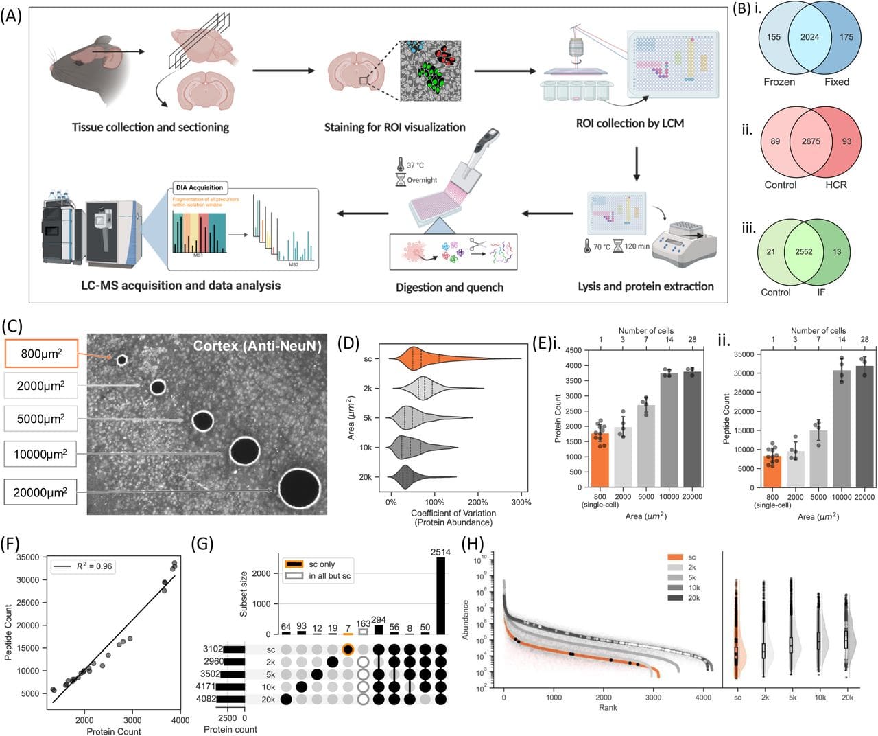Design and optimisation of molecularly-guided spatial single-cell proteomics for CNS tissue. From Dutta et al., 2025. “Molecularly-guided spatial proteomics captures single-cell identity and heterogeneity of the nervous system“, bioRxiv 2025.02.10.637505; doi: https://doi.org/10.1101/2025.02.10.637505. Licensed under the terms of the Creative Commons CC-BY 4.0 license.
