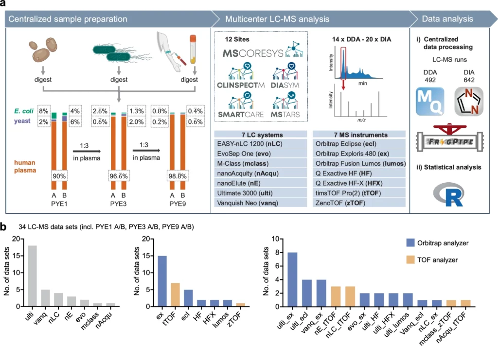Distler et al. evaluated label-free quantification performance and benchmarked standardised workflows for neat plasma analysis across twelve partner sites of the MSCoreSys clinical proteomics consortium. They developed the PYE sample set (a human tryptic plasma digest spiked with varying amounts of yeast and E. coli proteomes) to simulate physiological dynamic range while providing known protein ratios for accuracy assessment.