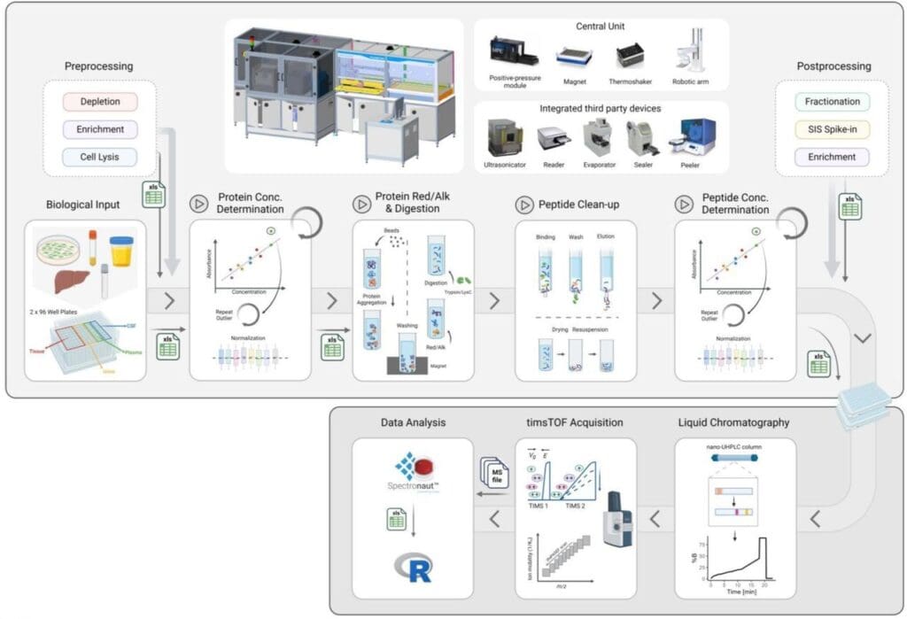 To address these limitations, Schär, Räss et al. developed an automated, end-to-end sample preparation platform designed to process up to 200 samples per day with minimal hands-on time. The modular system integrates pre-processing, main sample processing, and post-processing blocks, accommodating diverse sample types including cultured cells, biofluids, and tissues from mid- to bulk-input levels. The platform utilises protein aggregation capture (PAC) protocol with automated liquid handling, temperature control, and error recovery systems.