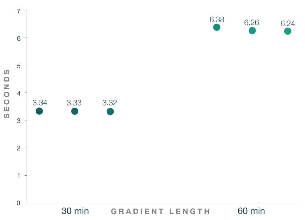 Figure 2: Average full width at half maximum (FWHM) for all identified peptides from Hela Tryptic Digest injections (200 ng) on an Aurora Ultimate 25 cm x 75 μm XT column. 3 replicates were run per condition. Each point represents the average FWHM for an individual replicate. Samples were run on Thermo Fisher Scientic’s Vanquish Neo LC and Orbitrap Exploris 480 mass spectrometer with FAIMS Pro Duo. FAIMS CVs of -45V for 30 min gradient and -45/-65V for 60 min gradient were used. Data analysis was performed using Spectronaut 18 (Biognosys AG).