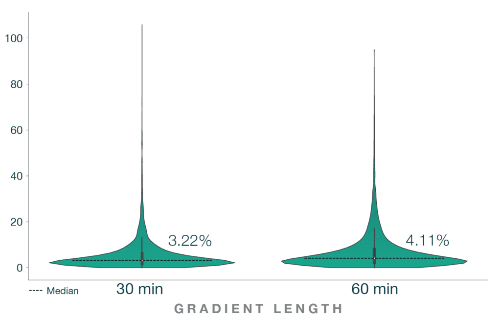 Figure 4: Low CVs across different gradients. Violin plot of the Coefficient of Variation for all protein intensities identified across all replicates from HeLa Tryptic Digest injections (200 ng) on an Aurora Ultimate 25 cm x 75 μm XT column. 3 replicates were run per condition. Samples were run on Thermo Fisher Scientic’s Vanquish Neo LC and Orbitrap Exploris 480 mass spectrometer with FAIMS Pro Duo. FAIMS CVs of -45V for 30 min gradient and -45/-65V for 60 min gradient were used. Data analysis was performed using Spectronaut 18 (Biognosys AG).