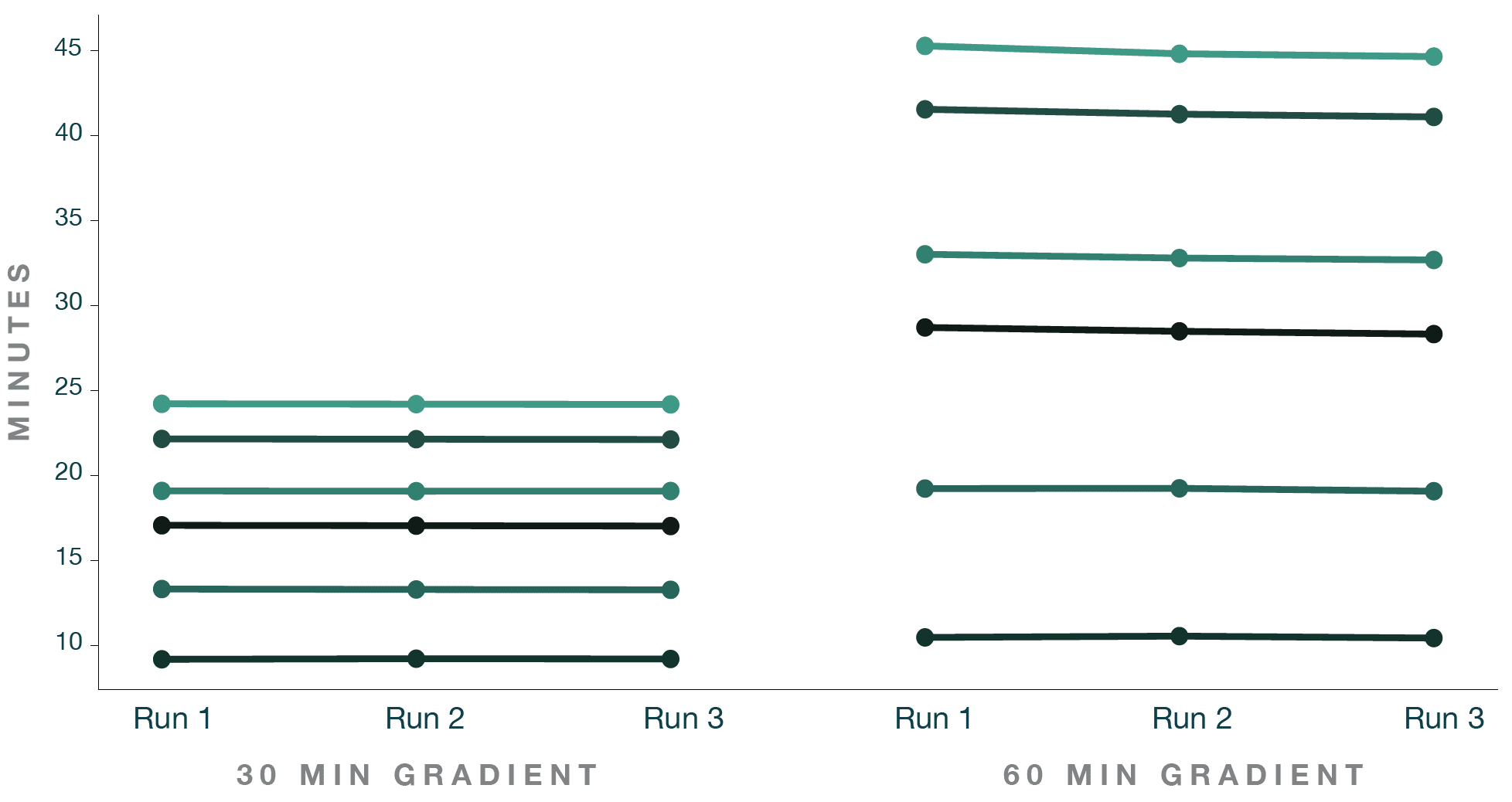 Figure 3: Stable peptide retention times across all runs. 6 peptides were selected and their retention time assessed across all runs from Hela Tryptic Digest injections (200 ng) on an Aurora Ultimate 25 cm x 75 μm XT column. Samples were run on Thermo Fisher Scientic’s Vanquish Neo LC and Orbitrap Exploris 480 mass spectrometer with FAIMS Pro Duo. FAIMS CVs of -45V for 30 min gradient and -45/-65V for 60 min gradient were used. Data analysis was performed using DIA-NN software (Version 1.9).
