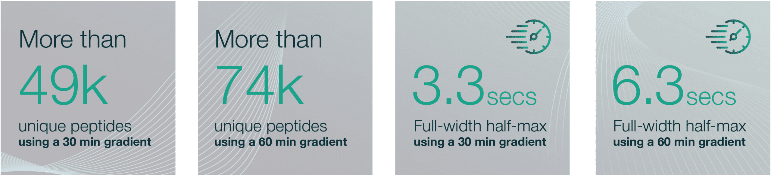 The Aurora Ultimate 25 cm x 75 μm XT columns demonstrate exceptional chromatographic performance, with narrow peak widths across different gradient lengths. The 30 minute gradient demonstrates particularly sharp peaks with average FWHM values around 3.3 sec, with the 60 minute gradient demonstrating FWHM values around 6.3 sec.