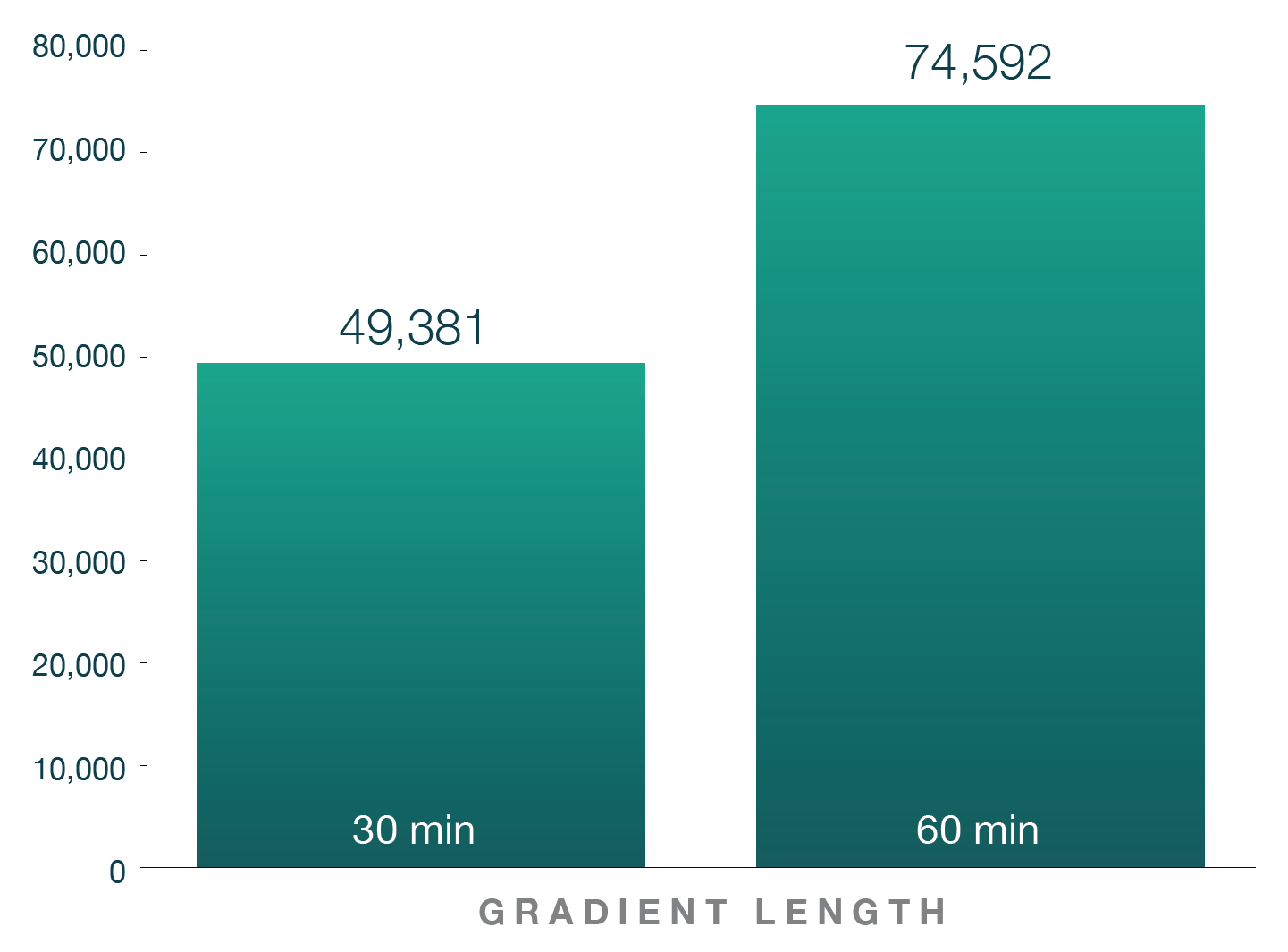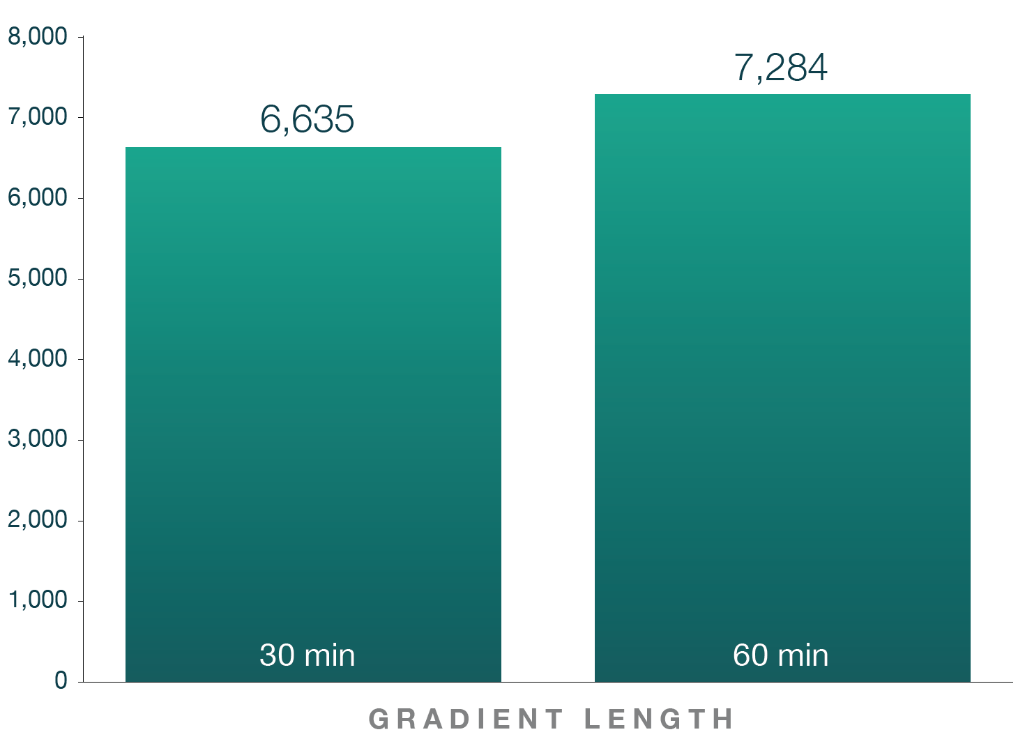 Figure 1: (A) Average protein group identifications across different gradients. (B) Average unique peptide identifications across different gradients. A HeLa tryptic digest (200 ng) was separated on an Aurora Ultimate 25 cm x 75 μm XT column. 3 replicates were run per condition. Samples were run on Thermo Fisher Scientic’s Vanquish Neo LC and Orbitrap Exploris 480 mass spectrometer with FAIMS Pro Duo. FAIMS CVs of -45V for 30 min gradient and -45/-65V for 60 min gradient were used. Data analysis was performed using Spectronaut 18 (Biognosys AG).
