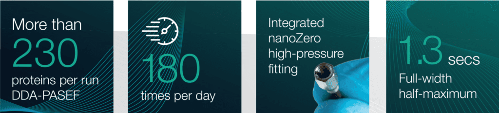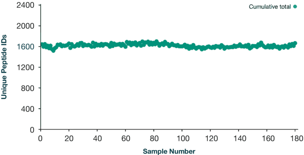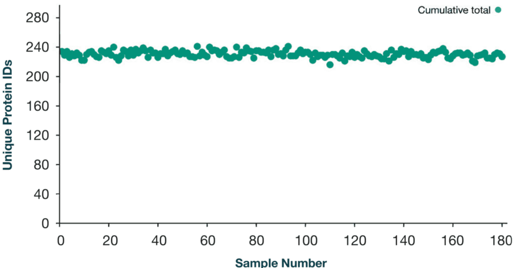 IonOpticks’ Aurora Series 5cm Rapid UHPLC packed emitter columns featuring our revolutionary nanoZero® fitting, allow for simplified plug-and-play high-throughput proteomics. These columns are capable of analysing 180 samples per day with a 5 min gradient. Tryptic digested Human Plasma was injected and separated using our 180 samples per day method and data dependent acquisition using PASEF resulting in >230 protein identifications (>1,600 unique peptide identifications) [Fig1, Fig 2] with highly reproducible peptide retention times between runs [Fig 3].