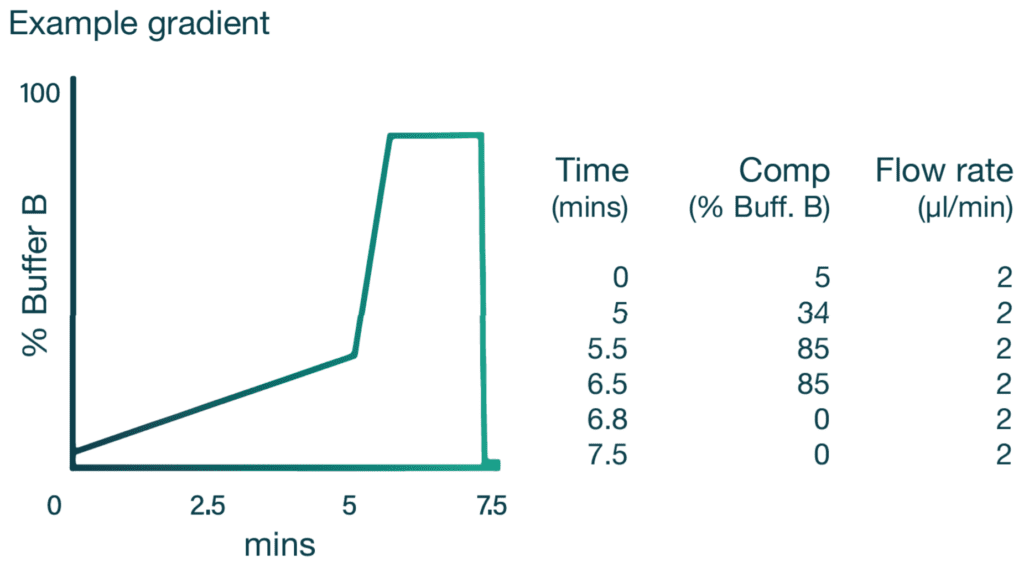 Human Plasma tryptic digest was reconstituted in 2% acetonitrile/1% formic acid in MilliQ water to a concentration of 50 ng/μL. Samples were analysed on a M-class (Waters, USA) coupled to a timsTOF Pro (Bruker) equipped with a CaptiveSpray source. 50ng (1μl) of peptides were separated on an Aurora Series 5cm X 150μm Rapid UHPLC packed emitter column, using a constant flow rate of 2μl/min. The column was maintained at room temperature. Sample was injected into a sample loop which takes approximately 0.5min. Mobile phase at 100% buffer A continues to flow over the analytical column during this period facilitating column equilibration. The sample loop was switched on-line for 1min at 100% buffer A. A recommended sample gradient is shown here.