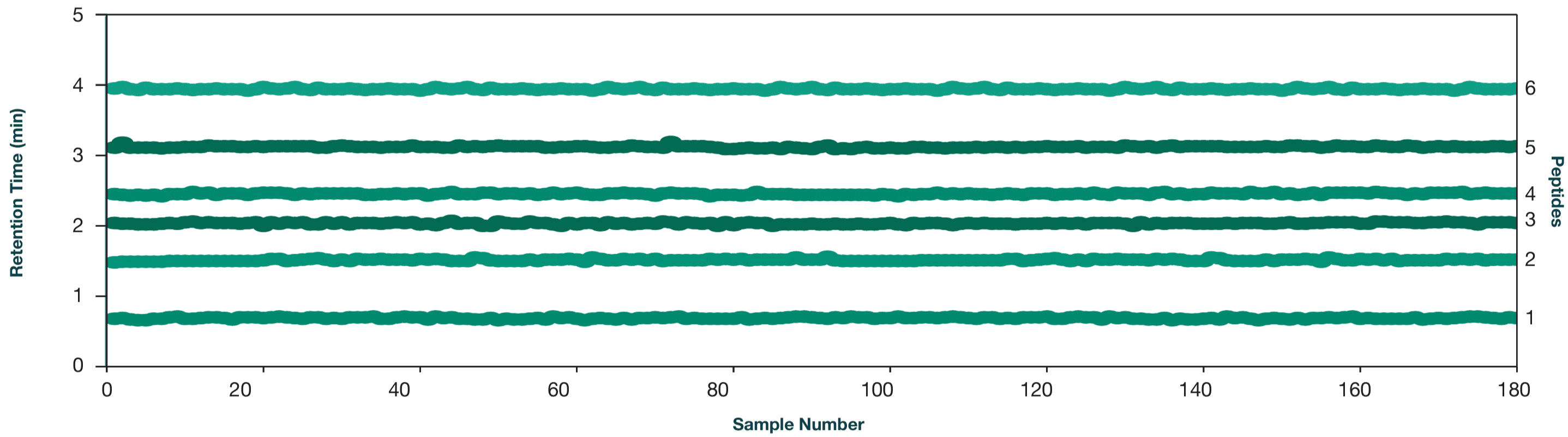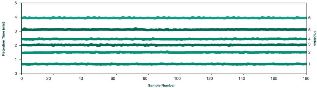 Fig 3 Retention time comparison for 6 different peptides across 180 samples