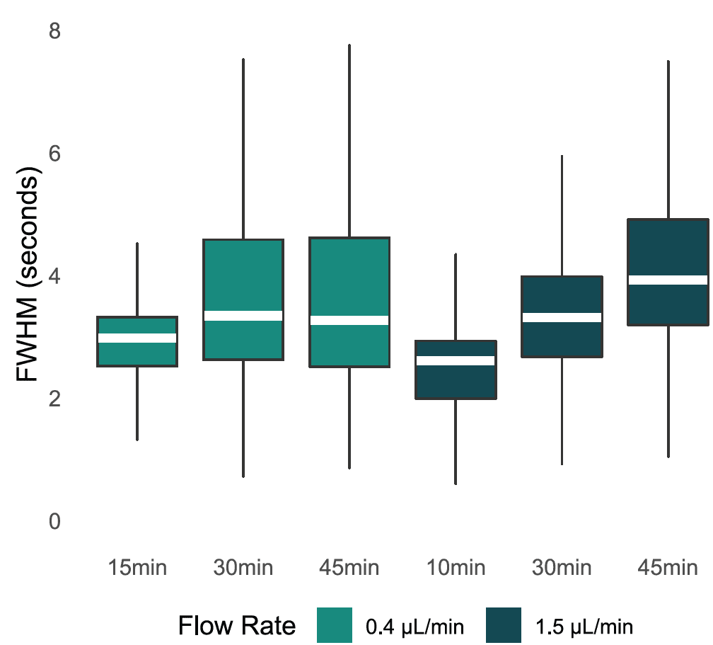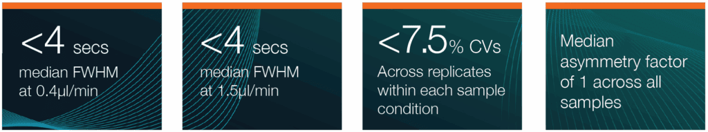 Figure 1: Example peaks were chosen across the 1.5μl/min 30 min gradient. All peaks show excellent FWHM and symmetry through the entire gradient.