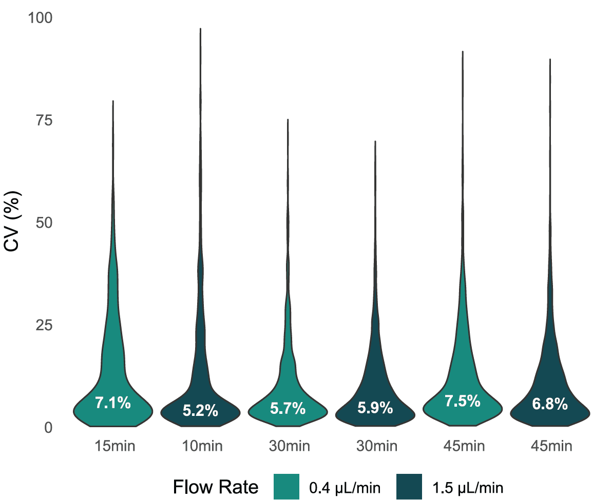 Figure 3: HeLa tryptic digest was run on an Aurora Elite 15 cm x 150 μm column. Gradients 10min, 15min, 30min and 45min were run at flowrates 0.4 ul/min and 1.5 ul/min (4 replicates). Coefficient of variations of protein intensities were calculated across runs within each condition. Resulting calculations show sub 8% median CV across all samples.